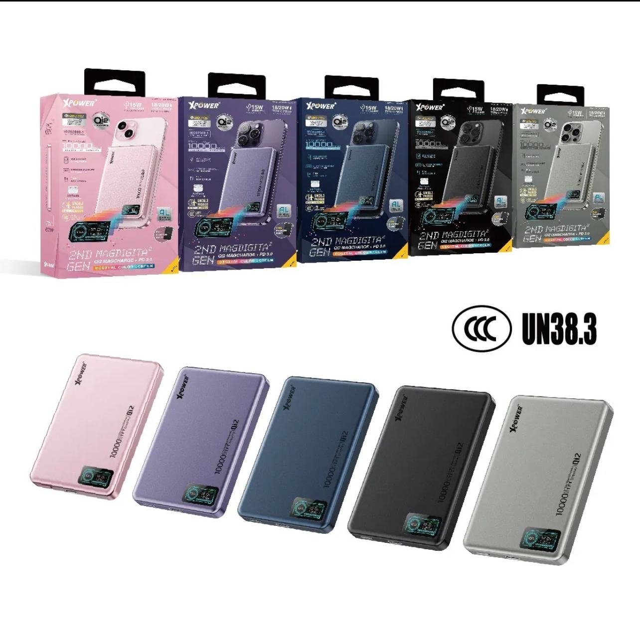 (3C認證版)(鋁合金面) XPower MagDigita² 第2代 彩屏顯示10000mAh PD3.0+QI2 磁吸移動電源 產品介紹: •兼容Qi2技術,可為iPhone 12-17系列及相容的Android 電話提供最大15W磁吸無線快充 •可快充iPhone 12-17 Plus, Pro, Pro Max及Android等多種機款 •無線充支援iOS電量顯示 •不虛標真10000mAh石墨烯負極100%純鈷電池,加強散熱效能 •2KG強大吸力,2600GS N52強力磁鐵 •CNC圓邊切割鋁合金機身 •彩色TFT電量顯示面板 •附送60W Type-C線 •安全認證:UN38.3 / 3C / CE / ROHS / IEC 62368-1 •安全保護裝置: 短路/過充/過放/過熱/過流保護 •尺寸: 102 x 67 x 13(mm) & 182g 🔥🔥🔥🔥🔥🔥🔥🔥🔥🔥🔥 顏色: 黑 🖤藍 💙粉 🩷紫💜鈦色