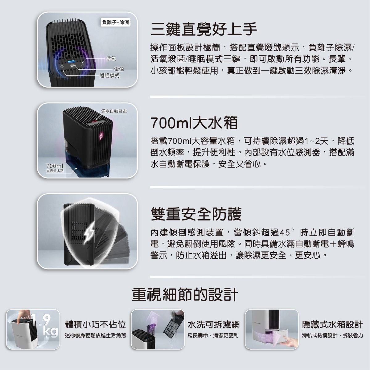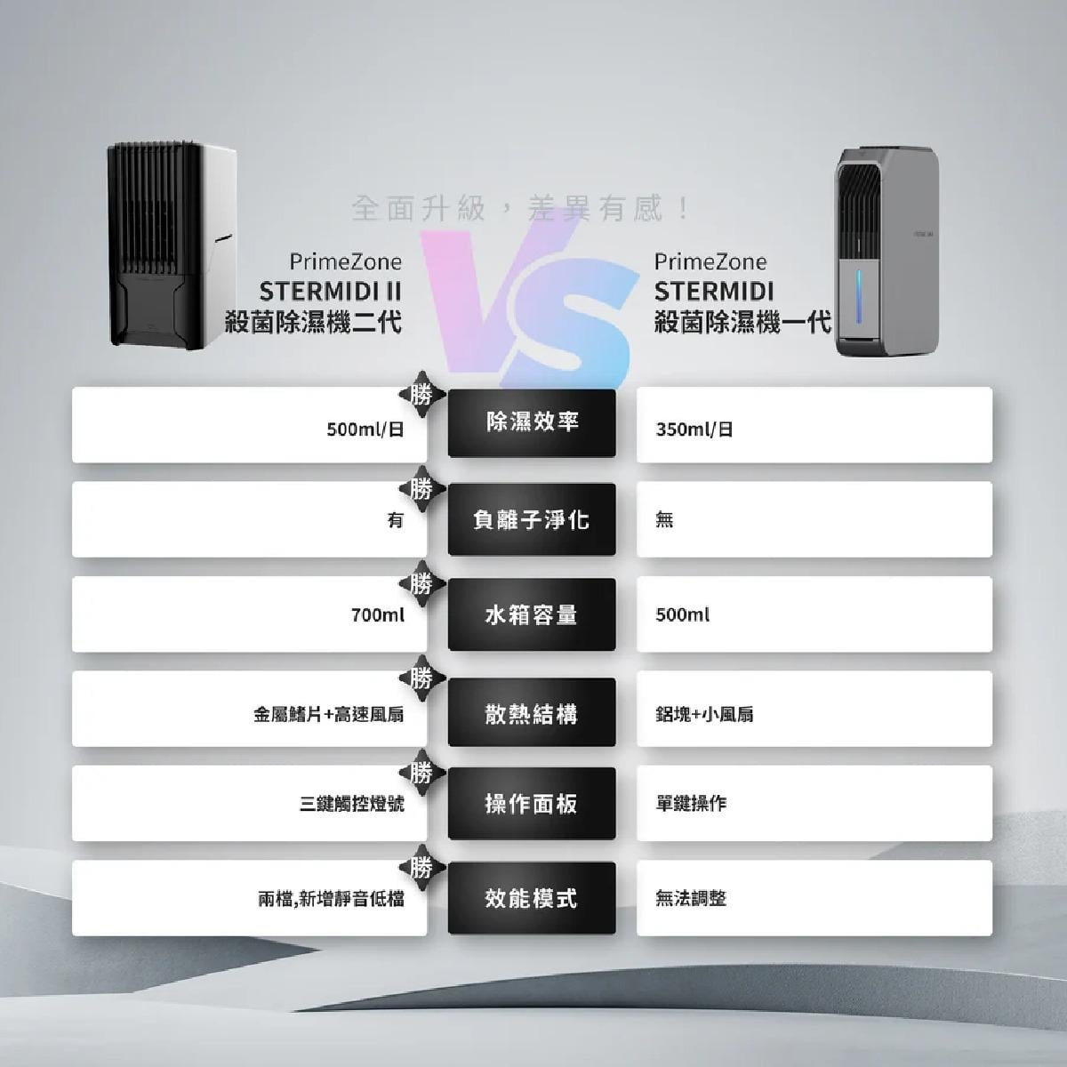 【Prime zone】 STERMIDI II 殺菌除濕機第二代 熱賣於台灣和香港的殺菌除濕機,迎來了第二代!STERMIDI II 保持了其小巧設計,專為香港用戶而設,能有效除濕和殺菌,潔淨空氣,非常適合廁所、衣櫃、房間和客廳等各種空間。 產品升級亮點 • 最高除濕量:每日最高可達 500ml • 增強水箱容量:700ml,持續運作超過 1-2 天 • 活氧釋放:每次可釋放 50mg 活氧,有效破壞細菌結構,分解異味分子 • 負離子淨化:每次釋放720萬顆負離子,主動吸附空氣中的懸浮微粒和異味 • 噪音控制:運轉時噪音低於 46dB • 簡潔面板:設有負離子除濕、活氧殺菌和睡眠模式三鍵 • 雙重安全防護:傾斜超過 45° 自動斷電,水滿時自動斷電並發出警示 • 安全認證:具有 CE 認證,符合國際安全標準,V0 等級防火材質 產品規格 • 尺寸:242 × 214 × 120 mm • 重量:約 1.9kg • 濾網:可拆式初階濾網(支持水洗) • 能效:超低功耗(待機約 0.3kWh/日) • 適用坪數:約 2–7 坪(建議用於密閉小空間) • 除濕能力:高檔 500ml/日、低檔 350ml/日(30°C / 80% RH) • 適用室溫範圍:10℃ ~ 30℃(儲存可至 -10℃ ~ 70℃) • 電壓:AC100–240V / 50–60Hz • 水箱容量:700ml(水滿警示+自動斷電) 顏色: 雲朵白/深空黑