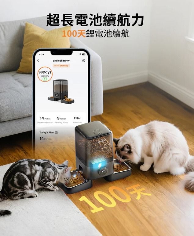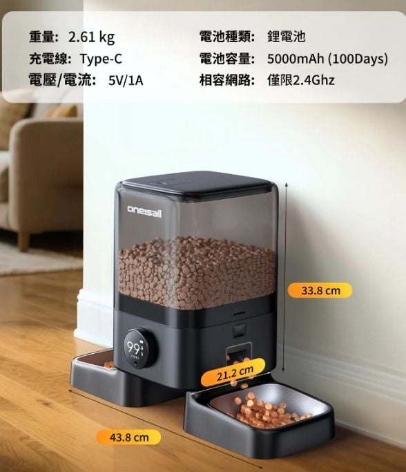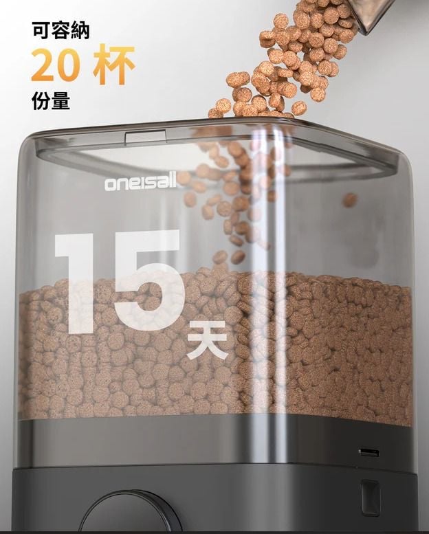 美國Oneisall - 寵物護理系列 美國品牌 | 香港行貨 ————————— Oneisall – 5L 雙碗無線智慧寵物餵食器 美國Oneisall最新推出5L 雙碗無線智慧寵物餵食器,升級無線設計,突破環境局限,自由選擇擺放位置。Oneisall 5L 雙碗無線智慧寵物餵食器,最多可設置10個餵食計劃,一次更可提供多達12份膳食,最長可容納15天食量,根據您的寵物制訂餵食計劃。防卡糧設計,最大18mm直徑糧粒亦適用。 產品特點 👍透過應用程式控制和追蹤寵物的飲食習慣。 👍電池續航時間長達 100 天並配備應用程式追蹤功能,非常適合旅行用家。 👍最大18mm直徑糧粒適用。 👍無線設計,可避免電線被主子啃咬。 👍5L / 20 杯容量: 可容納一整包 5 磅的貓乾糧。 👍簡易設計,設定和餵食無難度。 產品規格 尺寸: 33.8 x 21.2 x 43.8 cm 重量: 2.61 kg 電池容量: 5000mAh 充電時間: Type-C充電,約6小時 使用時間: 最長100 天