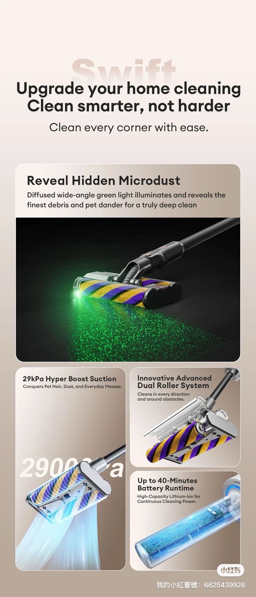 https://youtu.be/sD2yRYwTo_w?feature=shared 👀【掃盡隱形塵】 Airbot Swift新登場! Airbot Swift 無線吸塵機終於嚟到香港!輕身得嚟吸力強,連你睇唔到嘅塵都唔放過,屋企乾淨晒!而家仲有限時早鳥優惠,唔搶真係走寶~ 【產品亮點】 •⁠ ⁠綠光LED顯塵燈:照出肉眼睇唔到嘅微塵 •⁠ ⁠雙滾刷頭設計:硬地板/地毯一樣應付自如 •⁠ ⁠超靈活轉向頭 + 180度躺平設計:深入罅隙、梳化底、床底無死角清潔 •⁠ ⁠磁吸塵杯:單手拆裝,倒塵唔怕污糟 •⁠ ⁠29kPa 強勁吸力,兩段變速操作簡單 •⁠ ⁠主機淨重 1.8kg,靈活易操控 •⁠ ⁠可拆式鋰電池,續航最長可達40分鐘 •⁠ ⁠多吸頭配件:地板、床褥、窗簾、車廂一部包晒