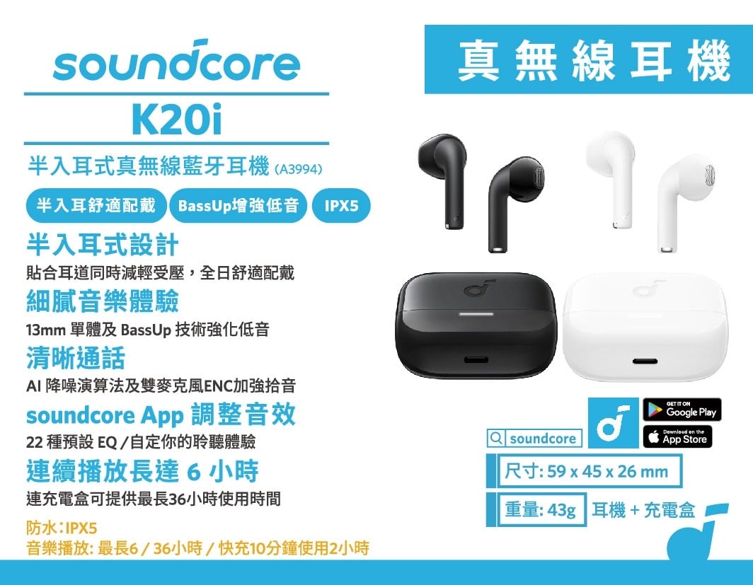 Anker soundcore K20i 半入耳式真無線藍牙耳機 (A3994)
