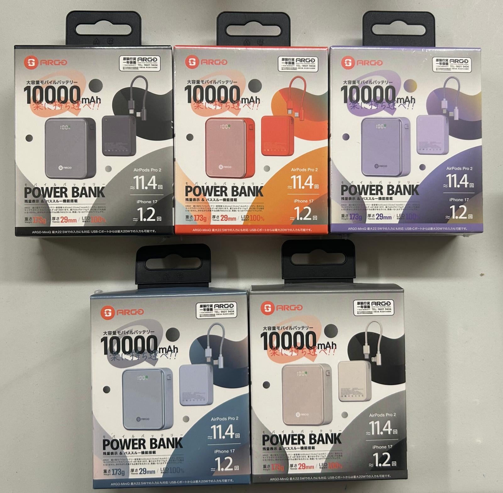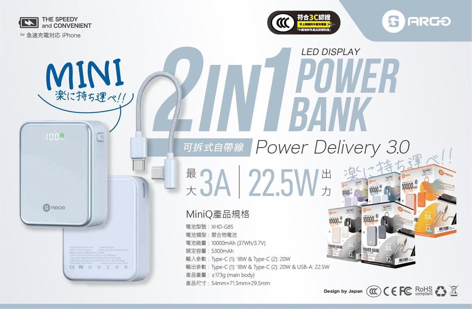 Argo MiniQ 10000mAh 超迷你快充神器 🌈 顏色: 🖤黑 🤍白 💜紫 💙藍 🧡橙 產品介紹 ✅ 10000mAh 小身材,大能量 ✅國內CCC認證,全國通行 ✅ 總輸出 5V=3A,三口同充不掉速 ✅ 雙 Type-C 20W PD 快充 ✅ USB-A 22.5W 閃充:支援 SCP / QC / AFC / FCP,華為、小米、三星全包! ✅ 雙向快充輸入:18W Max ✈️ 出門旅行、商務通勤、戶外露營都冇問題