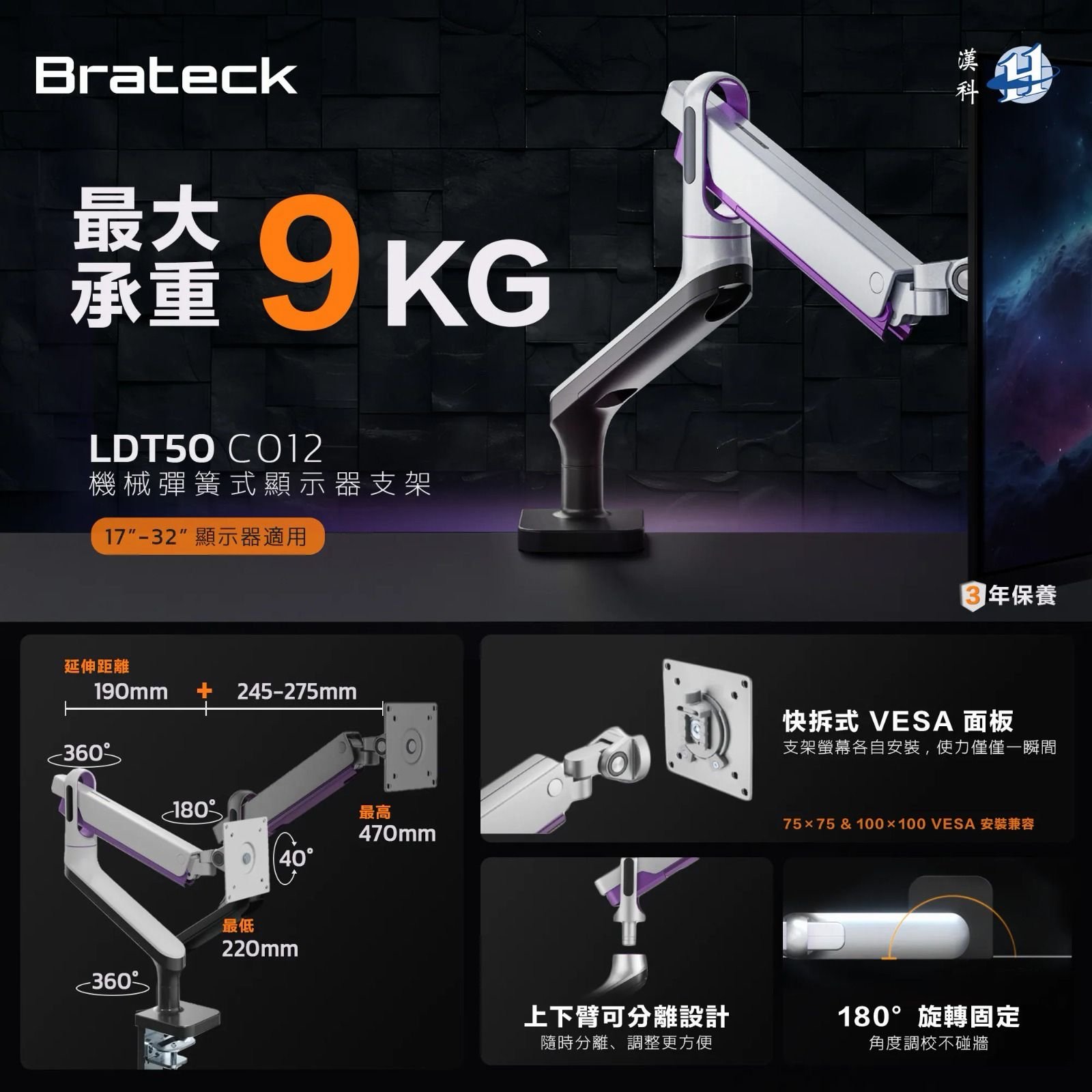 Brateck LDT50-C012 機械彈簧式顯示器支架 (MA-LDT50) ●可拆卸VESA板設計:安裝方便 ●內建彈簧張力機構:完美調整重量 ●180°旋轉停止:防止顯示器臂擺動到螢幕或牆壁上 MA-LDT50