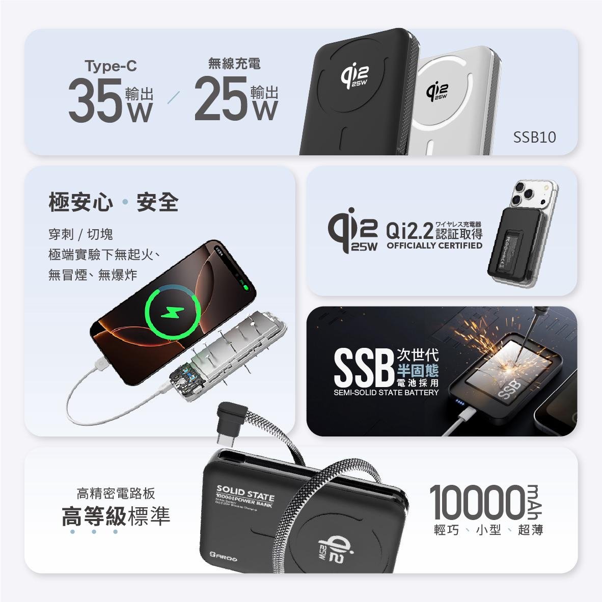 CCC認證🔥 Argo新款 SSB10 Qi2.2 35w Power bank重磅登場! ⚡️ 輕巧高效,科技感爆棚,陪你隨時隨地滿電出擊!💪 ✅CCC認證 + 全球通行,上機無憂! 中國CCC安全認證,品質硬核可靠。更支援航空全球通行標準,輕鬆登機,安全攜帶不設限!出國旅行再也不怕 ✅Qi 25W無線快充,完美匹配iPhone 17最速體驗! ⚡️ 搭載最新Qi2.2標準,25W高速無線充電,一放即充,效率飆升!專為iPhone 17設計,達到其Qi最快25W極限,0-50%電量僅需30分鐘 ✅半固態電池,顛覆舊有黑科技! 🔋 採半固態電池技術,告別傳統鋰電池的洩漏與過熱隱患,經1000次循環仍零衰退,安全耐用,開啟未來能源新紀元! ✅35W自帶線高功率專屬線材即插即用超方便! ✅自帶支架,追劇看片橫向美感滿分! 隱藏式智能支架,一鍵展開,完美支撐橫向模式! 輸入: 5V/3A, 9V/3A, 12V/2.5A, 15A/2A, 20V/1.5A 轉出: 5V/3A, 9V/3A, 12V/2.92A, 15V/2.33A, 20V/1.75A (35w Max) 無線充電:5W / 7.5W / 10W /15W / (25W Max) 產品重量:221g (main body) 產品尺寸:105mm×67.2mm×19.8mm 顏色 :黑,白