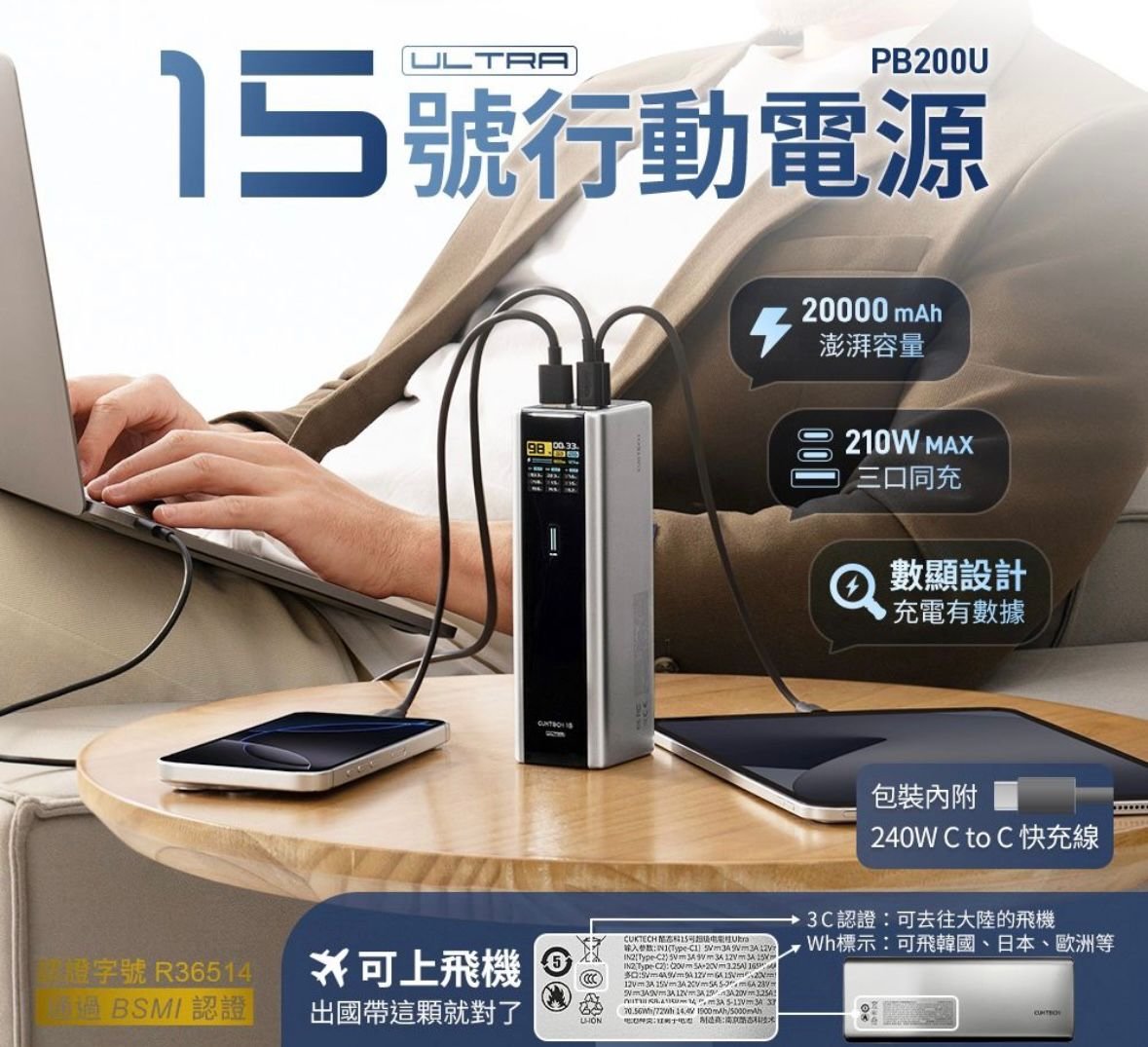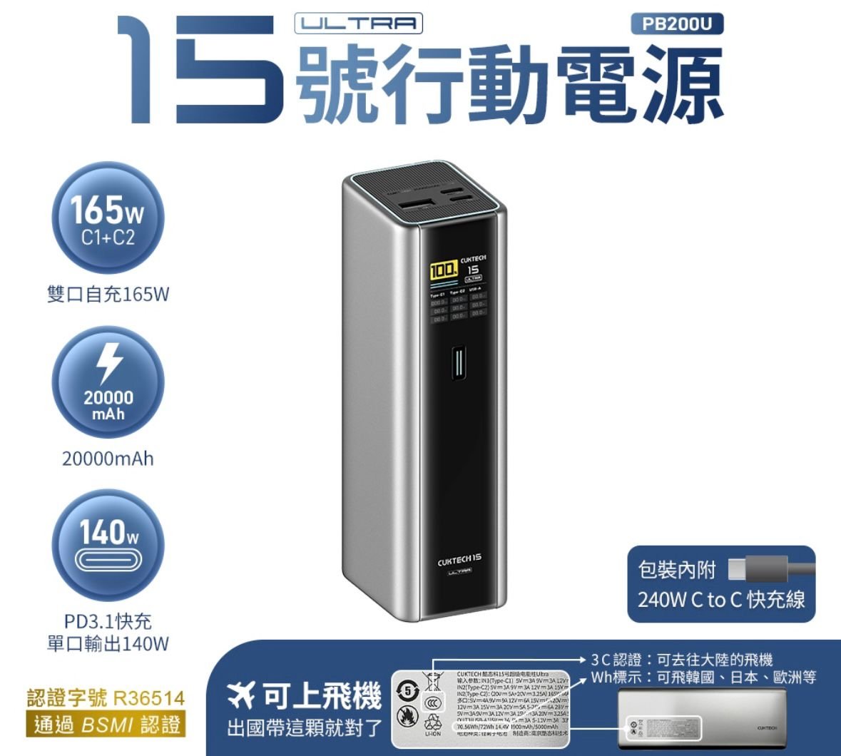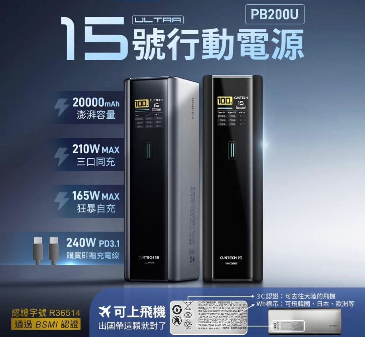 CUKTECH PB200U(酷態科15號Ultra) 210W 20000mAh Power Bank Model: PB200U 顏色 ⬜️ Grey 🔥🔥🔥🔥 🚨尺寸:152 × 44.5 × 57.1mm 🚨重量:590g 🚨通過CCC、BSMI認證,採用V0級防火材質,提升安全性 👑210W總輸出,支援三台設備同時充電 👑支援PD3.1、PPS、QC5、UFCS等多種主流與私有快充協議,兼容蘋果、三星、平板、筆電、Switch等設備 👑內建1.3吋TFT 彩色螢幕 👑實時查看電量、電壓/電流與功率 👑支援雙口自充,最高輸入功率可達165W,大幅縮短自充時間 👑具備小電流模式,適合藍牙耳機、智慧手錶等小型設備 👑出差、旅行與多設備用戶的高效充電選擇 👑港澳代理 一年保養