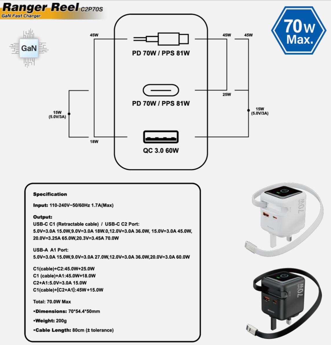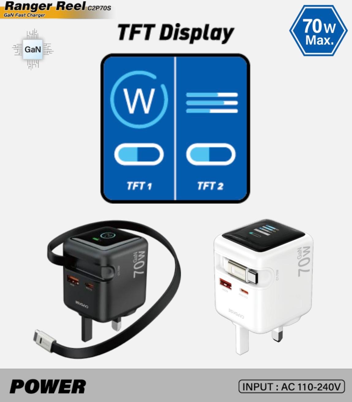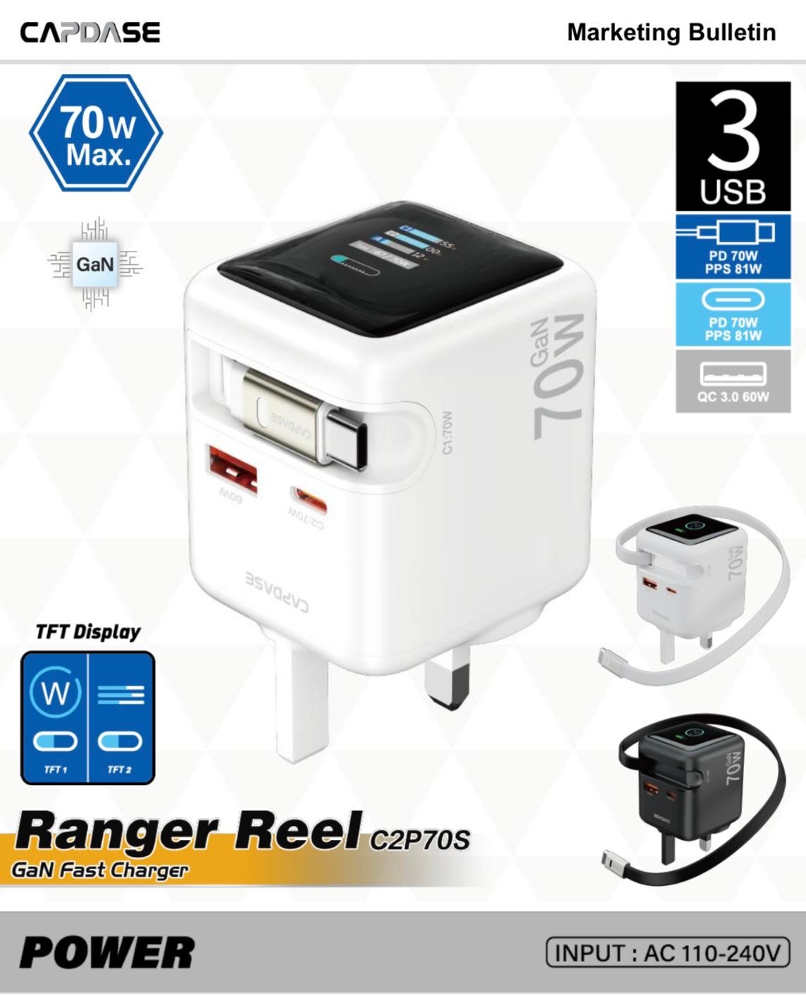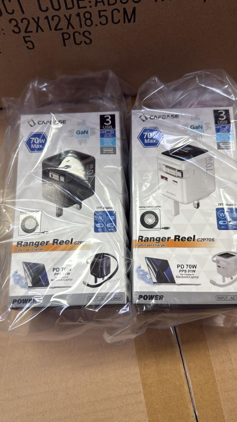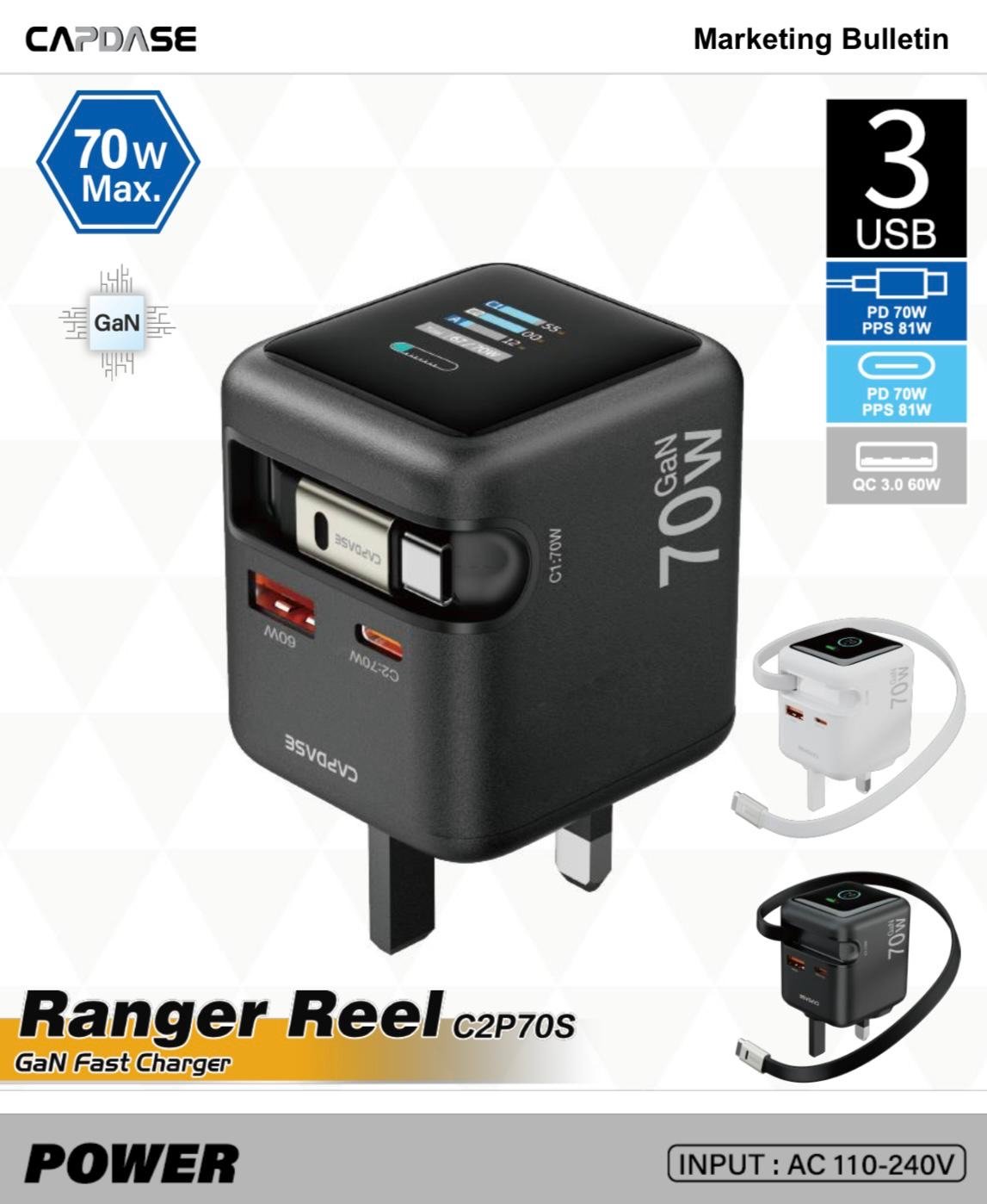 Capdase 70W 火牛 🔥🔥🔥🔥 🌐 TFT 薄膜電晶體液晶顯示屏,色彩鮮明及準確度高 🌐 GaN(氮化鎵),體積更小,方便攜帶 🌐 PD 70W 最大輸出功率及內置伸縮USB-C 線 🌐 可同時為最多3個設備充電 🌐 支援PPS, 提升快充兼容性和效率 🌐 港澳總代理 一年保養 Model: AD00-R1801-UK 🏴 黑色$258 Model: AD00-R1802-UK 🏳️ 白色$258