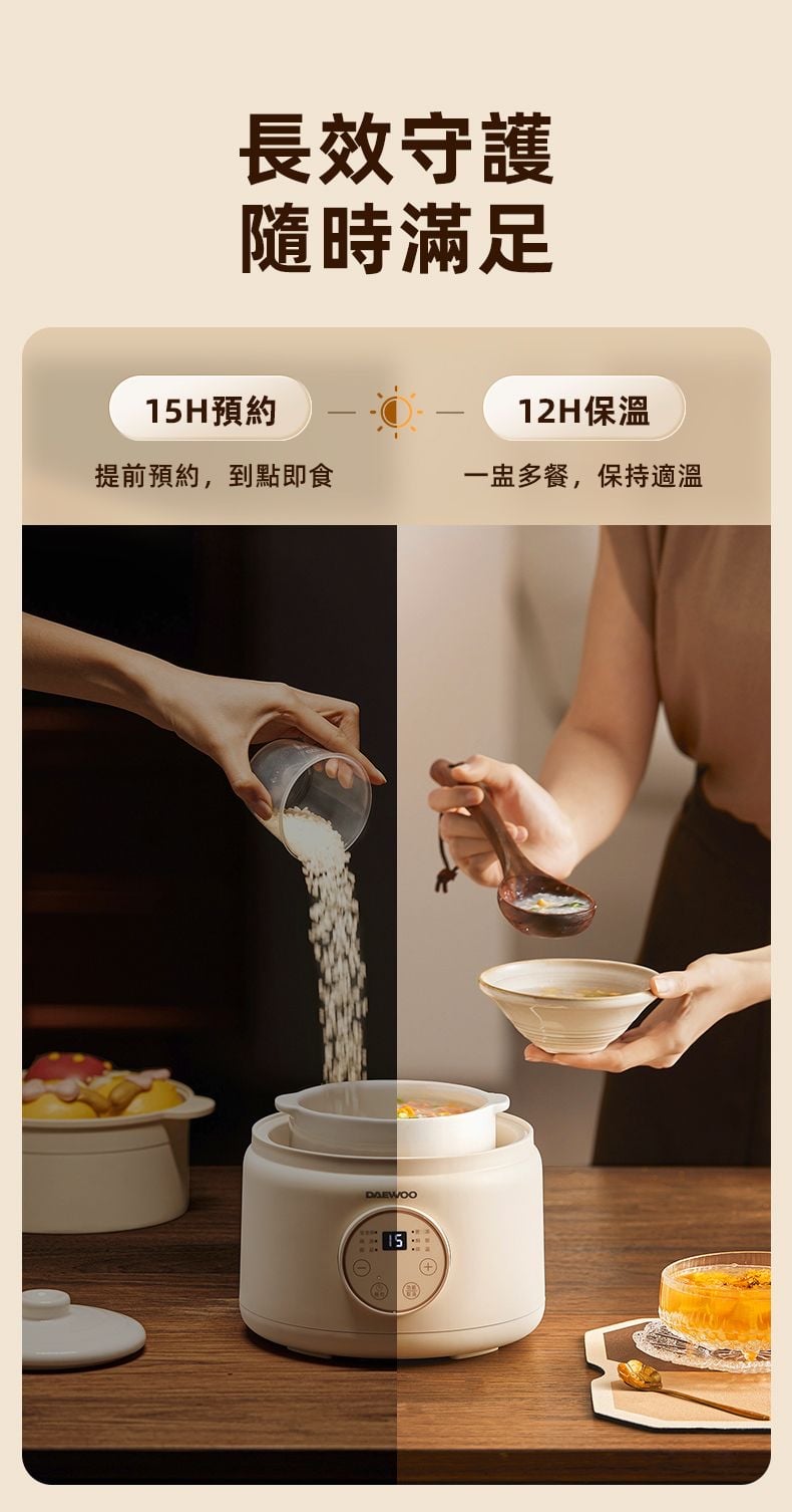燉湯/粥糊/甜品/蒸煮/燜飯/保溫,㇐鍵自動免看管 分體式設計,拆洗方便 簡約設計,上蒸下燉,㇐鍋多用 3D環流導熱設計,確保食材均勻受熱 1L容量,㇐次燉煮3碗份量 定時設計,12H保溫,15H預約料理 LFGB德國食品認證強化白瓷燉盅 雙蓋密閉微壓,實現鎖水熬燉確保營養 自動防乾燒,缺水斷電,安全省心 按鍵操作簡單易用