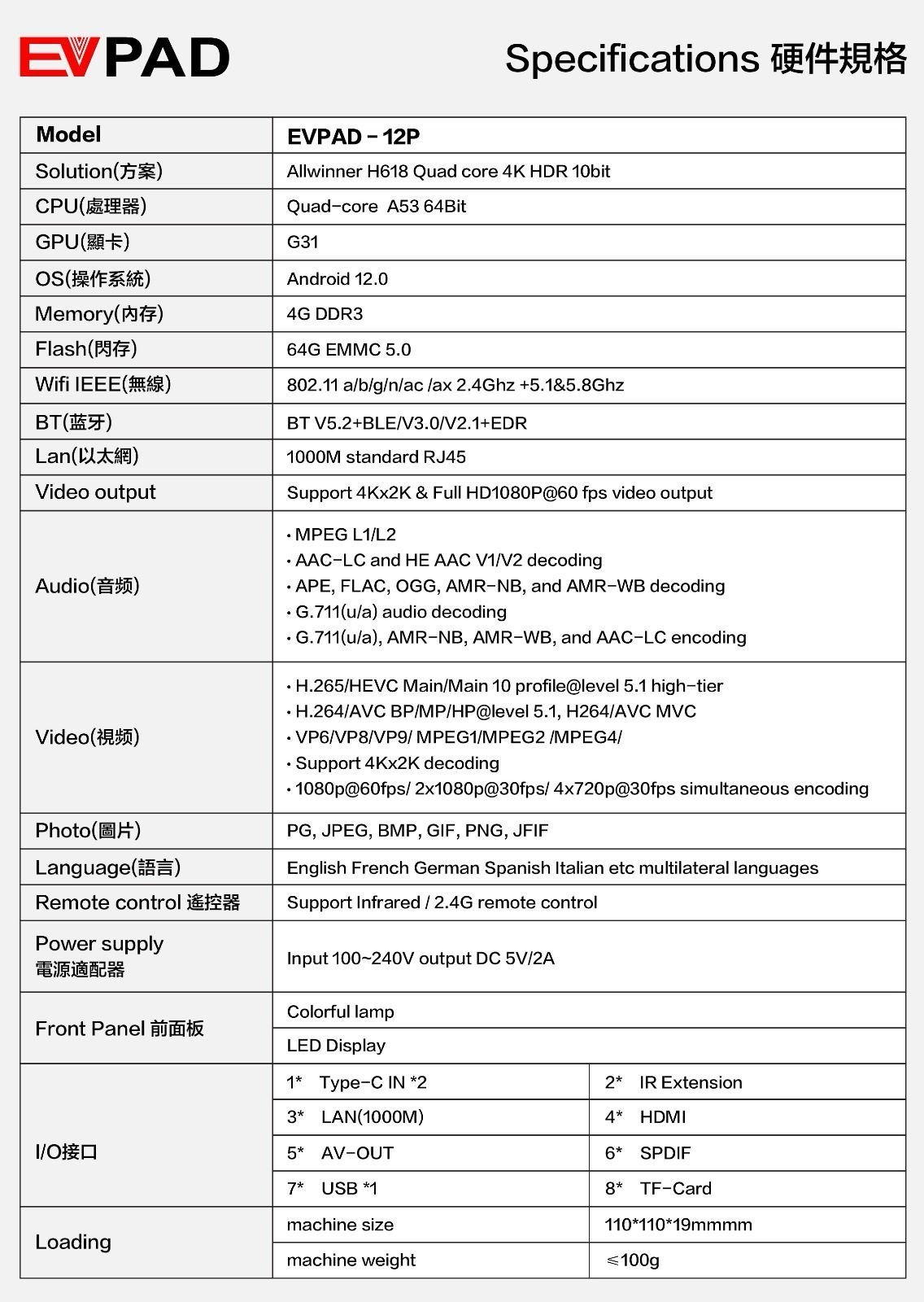 🎊EVPAD 12P全新登場!🎊 **手機版同場登場!打破界限!** (暫只支援Android手機系統) - Android 12⭐️ - Quad core A53 CPU - G31 GPU - 4GB DDR3 RAM - 64GB eMMC 5.0 ROM - WIFI 6 - BlUETOOTH v5.2 - 杜比視界 - 智能AI 功能 👇🏻矚目賣點,成就最強盒子👇🏻 -升級至Type-C供電 -升級至Android 12 -支援1000M Giga Lan -WIFI 6 (2T2R),速度更快更穩定 -支援直播多語言功能 -KTV app -時移功能⭐️ -極速轉台⭐️⭐️⭐️ -AI Google 助理功能 -點播智能AI推薦功能 -直播新增額外後備線路 -獨立大人apps,兒童apps -搖控器全面升級(飛鼠功能,方便遙距使用)(新增自選按鍵,方便老人家操作)