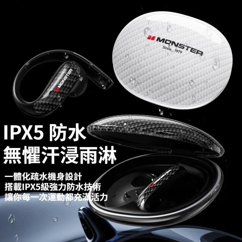 Monster MQO37藍牙6.0 *不入耳* 開放式藍牙耳機🏃 碳纖維工藝|藍牙6.0|零衝力無感配戴 藍牙版本:v6.0 單耳續航:約4小時 充電接口:TYPE-C 靈敏度:121±3dB 頻率響應:20Hz-20KHz 驅動單元:¢12mm 阻抗:32Ω±15% 耳機電池容量:3.7V/35mAh*2 充電倉電池容量:300mAh 充電時間:約2小時 防水等級:IPX5 產品重量:約53g 內容物:耳機+充電倉+充電線(A to C)