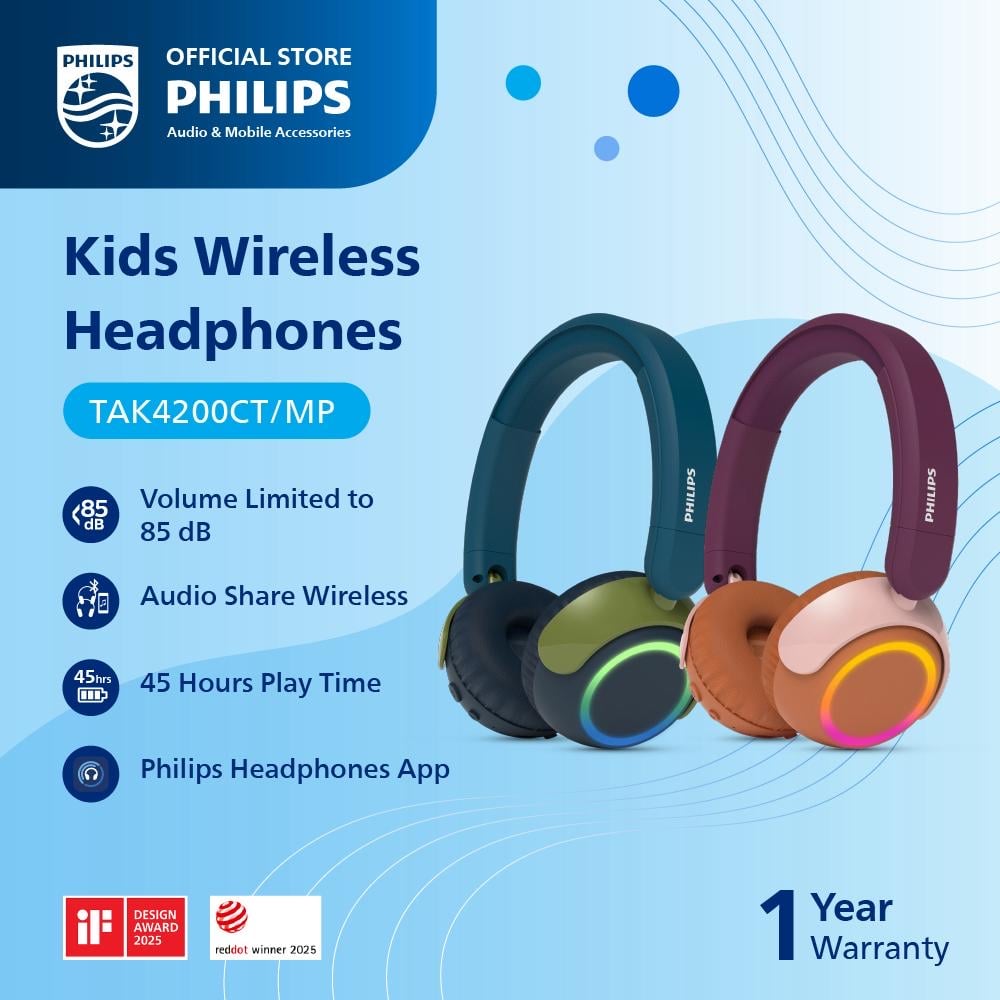 Philips 飛利浦 TAK4200 專為兒童設計👧🏻👶🏻頭戴式藍牙耳筒 🏆iF Design Award 2025 🏆Redot Winner 2025 型號 TAK4200CT/00 🟢綠藍色🔵 TAK4200MP/00 🟣紫啡色🟤 港澳代理 一年保養 🌼採貼耳式設計,輕身,頭帶與耳墊均為軟墊,小朋友長時間使用👍🏻 🌼內建彩色 LED 燈🌈多種燈效模式 🌼耳機具備音量限制功能,預設為約 75 分貝「家用/學習模式」,可透過專用 App 切換到最高 85 分貝的「旅行模式」 🌼採用藍牙 5.4,支援 A2DP、AVRCP、HFP 等模式,能連接手機、平板、電腦等裝置,並支援多點連線,同時連兩個設備方便在課業與娛樂間切換 🌼內建麥克風與降噪演算法,可清晰通話或上線上課堂 🌼支援 Siri、Google Assistant 等語音助手喚醒 🌼單次充電約 2 小時即可充滿,提供最長約 45 小時使用時間 🌼耳機可平折及向內折疊,方便收納