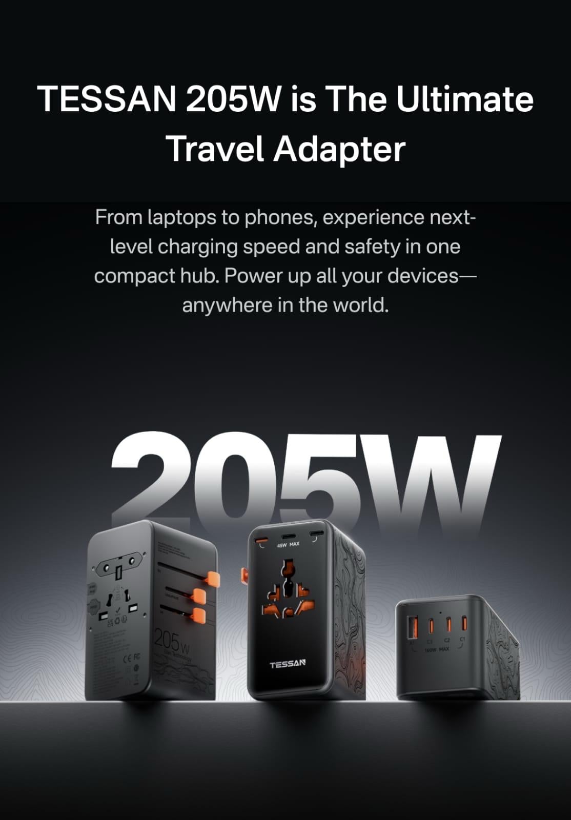 https://youtu.be/8qYPimMVPwk?si=fApaENCMZs179IG- Tessan Voyager 205w 旅行萬用插 🌎205W GAN Technology,可同時同時使用多達八個設備,包括筆記本電腦,智能手機和平板電腦,可快速,高效地充電。 🌎閃電般的性能:在短短47分鐘內將13英寸MacBook Pro(M1)收取50%。 🌎與200多個國家 /地區的電氣渠道兼容,消除了旅行期間多個充電器的需求。 🌎先進的安全功能,包括雙翼型保護,阻燃材料和自動關閉,以防止過載。 🌎緊湊和攜帶型設計(100mm x 55mm x 56mm,326克),具有時尚,簡約的美感,可輕鬆旅行。 🌎環保計劃與一棵樹種植合作夥伴關係,為每個售出的適配器造成了全球造林
