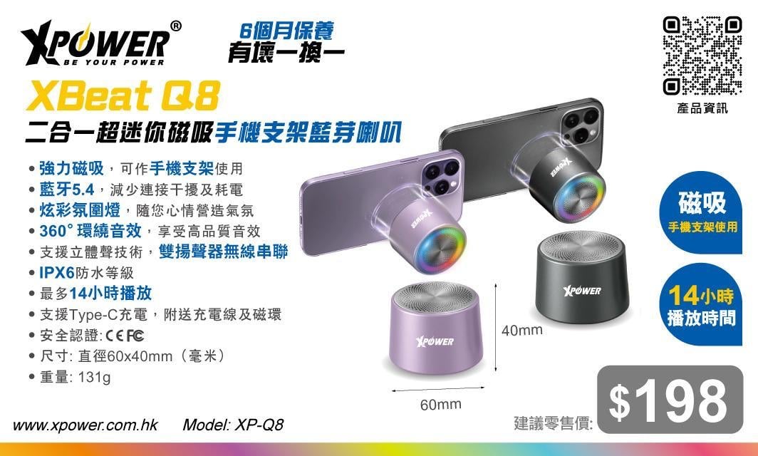 XBeat Q8二合一超迷你磁吸手機支架藍芽喇叭 •強力磁吸,可作手機支架使用 •藍牙5.4,減少連接干擾及耗電 •炫彩氛圍燈,隨您心情營造氣氛 •360°環繞音效,享受高品質音效 •支援立體聲技術,雙揚聲器無線串聯 •IPX6防水等級 •最多14小時播放 •支援Type-C充電,附送充電線及磁環 •安全認證:CE,FCC •尺寸: 直徑60x40mm(毫米) •重量: 131g