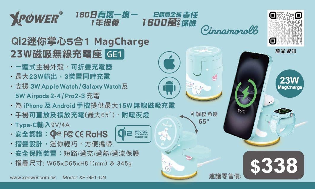 XPower x Sanrio Cinnamoroll GE1 Qi2迷你掌心5合1 MagCharge 15W磁吸無線充電座