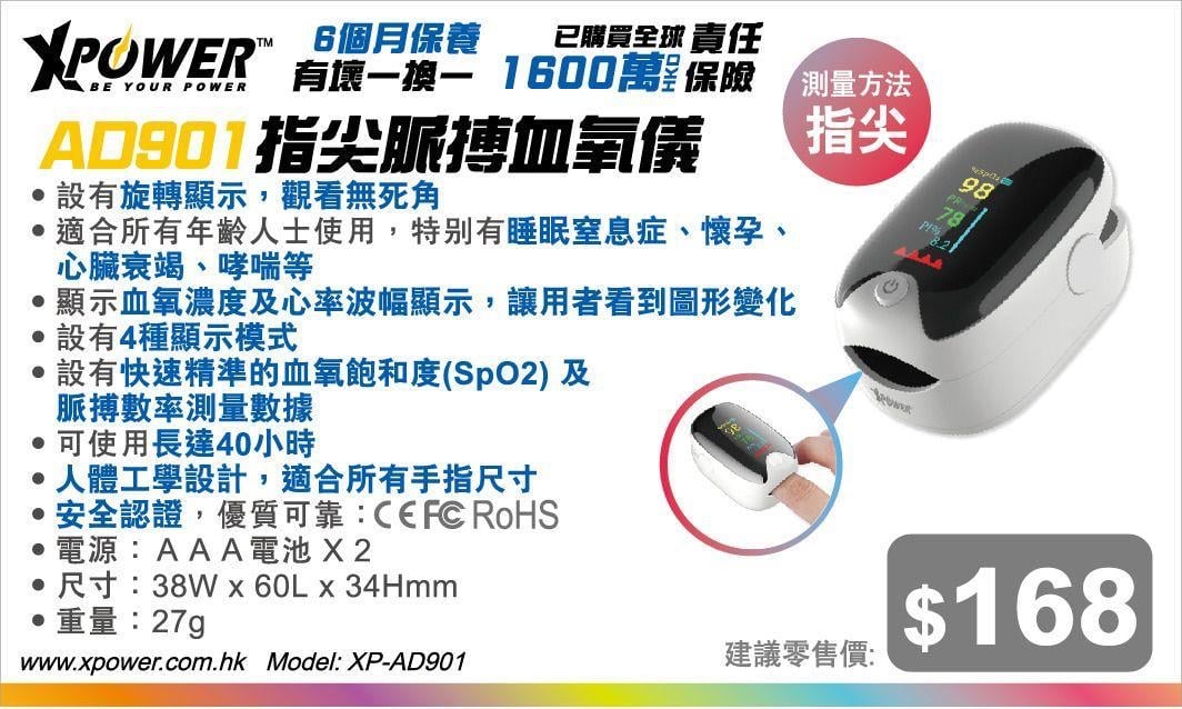 AD901 指尖脈搏血氧儀|血氧計|血氧儀|Oximeter •設有旋轉顯示,觀看無死角 •適合所有年齡人士使用,特別有睡眠窒息症、懷孕、心臟衰竭、哮喘等 •顯示血氧濃度及心率波幅顯示,讓用者看到圖形變化 •設有 4 種顯示模式 •設有快速精準的血氧飽和度(SpO2) 及脈搏數率測量數據 •可使用長達40小時 •人體工學設計,適合所有手指尺寸 •電源:AAA電池 X 2 •尺寸:38W x 60L x 34Hmm •重量:27g